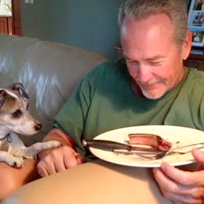 "Bone Appetit" A man and a Jack Russell terrier dog look back and forth at a plate of food at home in sync.