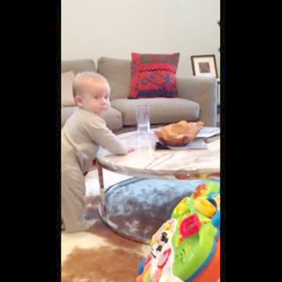 "H2O No-No" A baby boy keeps reaching for a water glass and looking back at mom every time she says "no." He gives her humorous looks.