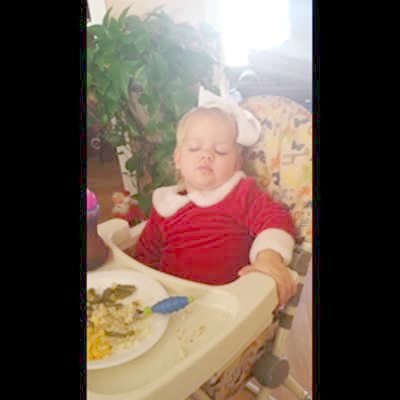 "Fake-Sleeping Santa Fan" A tot girl in a high chair pretends to fall asleep at home. Her mother accuses her of pretending and laughs. Another woman says, "Here comes Santa Claus" and the girl perks up suddenly.