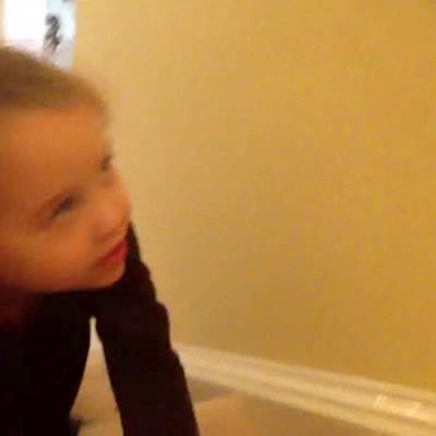 "Kids Caught Kissing" A tot boy and a tot girl pretend to host a TV show on a staircase indoors. The tot girl tells the tot boy to kiss her, he refuses, then kisses her on the lips at other kids' prompting. Mom walks into the frame from downstairs, catches them, and crosses her arms disapprovingly. They run away laughing.