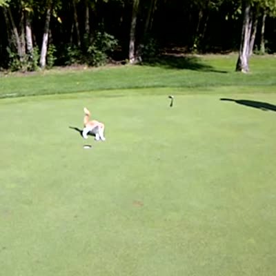 "Purr for the Course" Several men try to play golf on the putting green while a stray cat interferes.