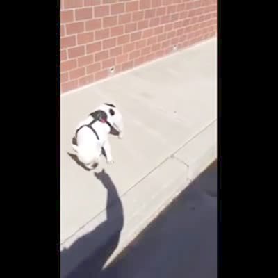 "Shadow Boxing Barker" A French Bulldog dog barks and bites at a dog shadow puppet on the ground outdoors.