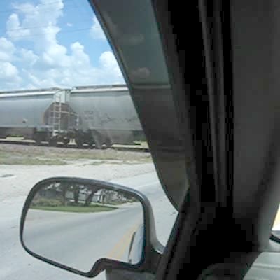 "Labor Pains and Passing Trains" Pregnant woman in labor paces outside of car as she and husband wait for train to pass while on way to hospital.