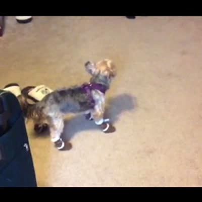 "Tiptoeing Terrier" A Yorkshire Terrier dog attempts to walk with shoes on and does a flip over itself indoors. Action at :17.