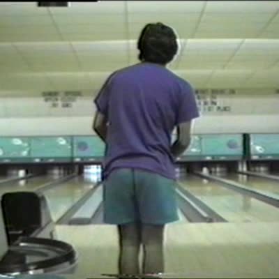 Bowler falls, from ground bowling rolls ball for strike.