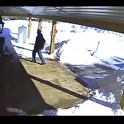 "Snow Shoveling Snafu" An adult man shovels snow and walks back into a building. As he shuts the door, a tremendous pile of snow slides off the roof right onto the newly-shoveled ground. This is security footage with no sound