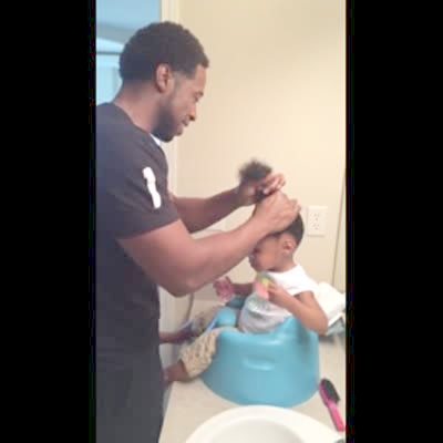 "Dad Hair Day" A man struggles to put a tot girl's hair into a pony tail at home. When he puts the band on her hair, it springs off and her hair pops up in two parts.