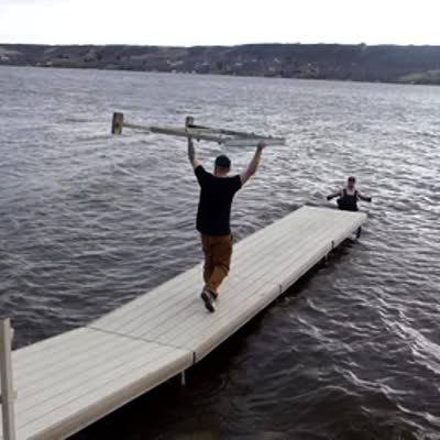 "Dock-Destroying Dude" A man walks a metal frame down a dock to a man putting the dock together and the newly placed pieces of the dock break off underneath him, sending him into the water as he runs back to the part of the dock that's still intact.
