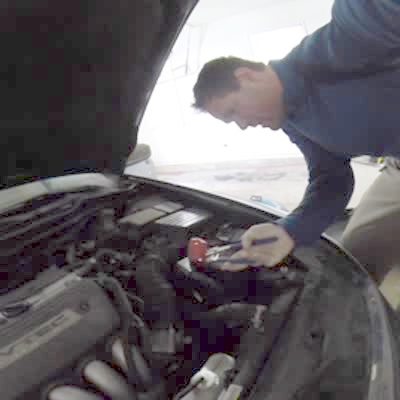 �Honk Under the Hood� A man changes a car battery and is startled by a little boy honking the horn from inside the car in a garage.