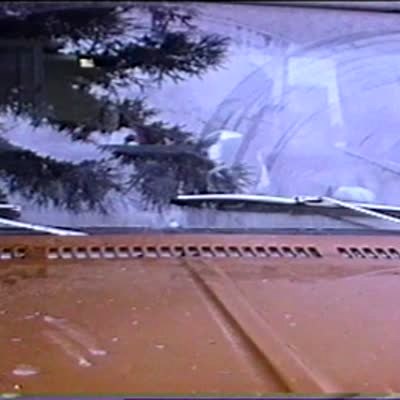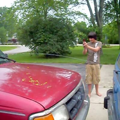 Rear windshield wiper sprays cleaning fluid onto the front windshield of a car parked behind it. 2 teen boys watch, excited.