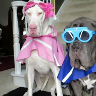 A dog in a pink cape with pink goggles and a wrinkly dog in a blue cape with blue goggles with windshield wipers on wait indoors to go outside in the rain.