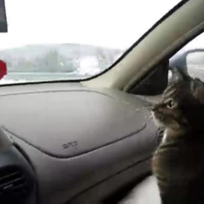 A cat hisses and jumps at windshield wipers while sitting in the passenger seat of a car.