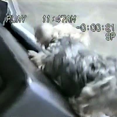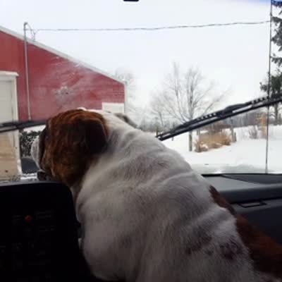 A dog bites at the windshield wipers from inside the car. He then falls off the car seat.