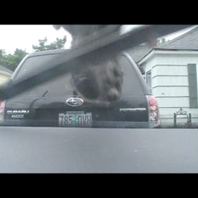 DOG. Boston terrier attacks windshield wipers from outside of car