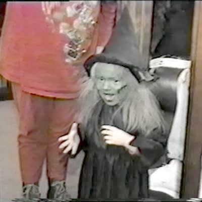 A young girl sees a Halloween decoration by the front door and says "I'm not scared of that witch," then screams when a mechanical spider jumps at her. Security footage.
