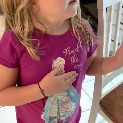A tot girl recites the Pledge of Allegiance in a kitchen, but she says "one nation, under dogs, for the witches."