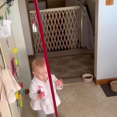 A baby girl balances a broom on its end in the kitchen. Her mom laughs and says "My baby's a witch."
