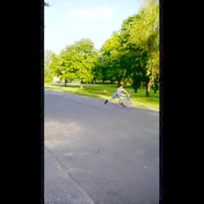 A young boy jumps and falls off his bicycle. The bicycle keeps going down the road without a rider.