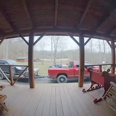 A man parks a pickup truck on a driveway and gets out of it, but the truck moves in reverse back into the driveway without him. He runs after it and yells "God damn it." Security footage. Night.