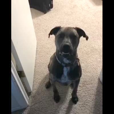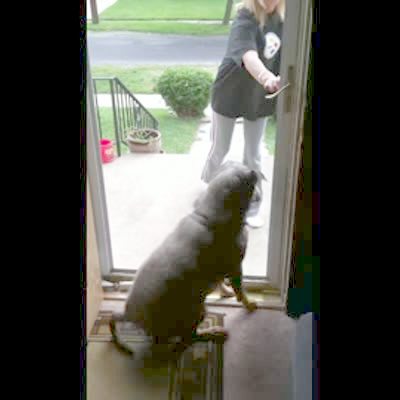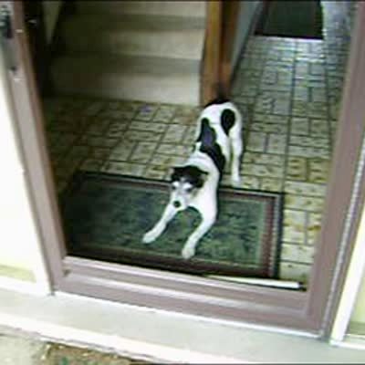 A woman walks through a screen door that's had it's window screen removed but her dog won't go through it and paws at the non-existent glass until someone opens the door to let him through. He does this repeatedly until he realizes there's no glass and walks through.