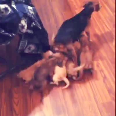 A beagle dog struggles to walk as her five puppy dogs nurse from her and won't let her go.