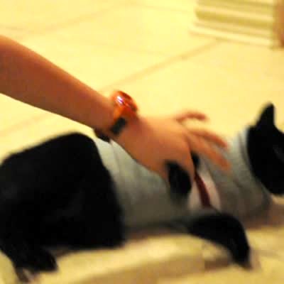 A pug plays fetch in the house. Gets the ball stuck in her mouth. She won't let man help her. Start at 0:34.