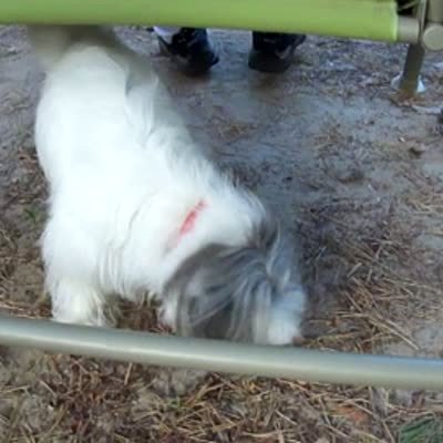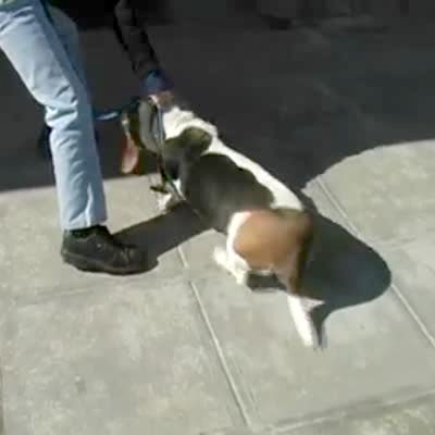 Dog won't go into store he realizes is the groomers. Dog tries very hard to run the other way. Woman holds dog on a leash. Doesn't want a bath.