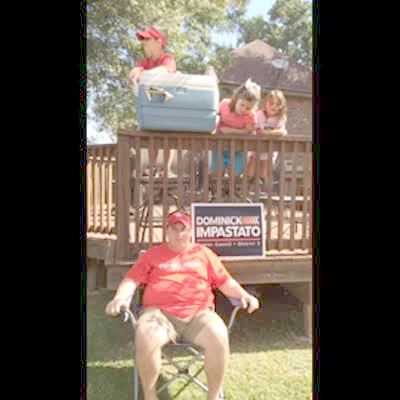 A man sits in a lawn chair for an Ice Bucket Challenge before his son and two daughters try to push a cooler of water over the porch railing behind him at 1:05:00. When it won't move, they whine that they can't do it and the boy pushes harder, causing the entire cooler to fall on the man's head before a younger child is heard crying. ALS Ice bucket challenge.
