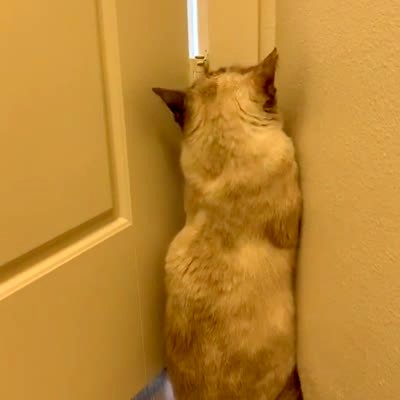 A cat hides up against the corner of a wall as another cat lurks on the other side. A woman tells the cat to come out, and that the other cat won't get it, and the cat turns around and looks at her over its shoulder.