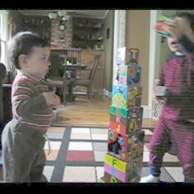 A young boy builds a tower for his tot brother to knock down. The tot boy won't knock the tower down so the young boy pushes his tot brother into the tower when his mother says to help him.