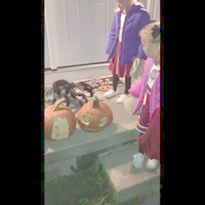 Two young girls try to get a spider decoration to move but it won't. Their tot sister steps near the spider and it jumps towards her. The tot girl screams and shakes.