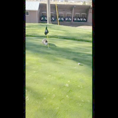 A cat sits next to a hole on a golf course and a ball comes towards the hole but won't go in, so the cat reaches over and pulls it into the hole.