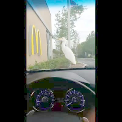 A series of clips where a large bird sits on the hood of a car and won't get off while a man drives it. In the first clip, the bird is on the hood while the man goes through a fast food restaurant drive through. The next two clips are while the man drives on the road.
