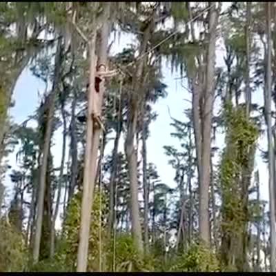 A woman stands in a tall tree attached to a rope swing. Her husband tells her she won't belly flop, then she falls off the rope and belly flops into the lake.