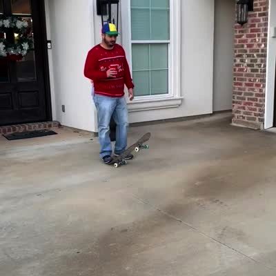 A man says he won't waste his drink, then falls off a skateboard and spills the drink in the driveway.