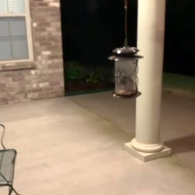A man captures a rat inside of a bird feeder on a patio when he then dangles it on a patio and assures a woman he won't put it on her. The rat then leaps out of the bird feeder and darts right towards her as she drops the camera and screams. She then yells at her husband and says, "he was comin' for me," as he giggles at her. First-person POV.