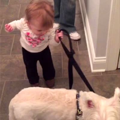 A tot girl holds a dog's leash and pulls on a West Highland terrier dog indoors but the dog doesn't move. She sits on the floor and pulls at the dog but the dog won't move.