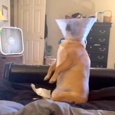 In a bedroom, a dog sits upright wearing a cone-of-shame as a woman says, "it won't be forever." The dog glares at her.
