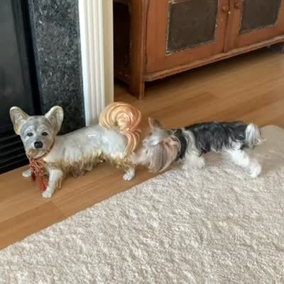 A Yorkie dog paws at a dog statue in the house house and barks at it when a woman says "he won't play with you?"