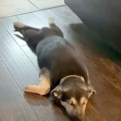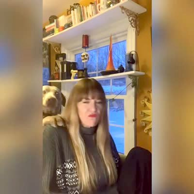 A woman records a video for work at home, but a dog jumps on her and barks. She records a different video for work, and he puts his nose on her elbow and stares at her, then touches her with his paw until she pets him. In the last video, he makes a lot of noise off-camera, and she yells. Produced video.