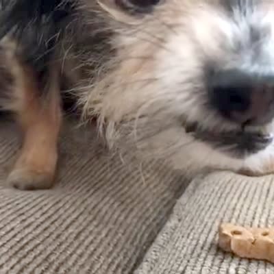 A small dog growls on a living room couch while she sits next to dog treats, then she jumps forward, and a woman laughs.
