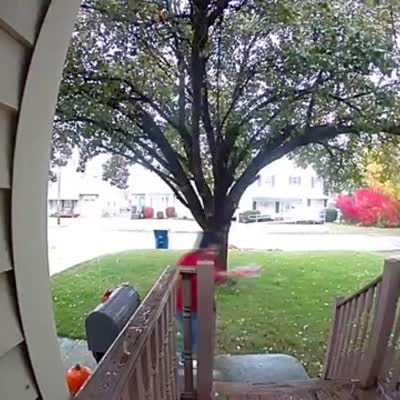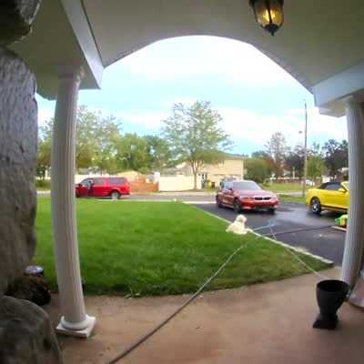 A dog sits in a front yard, then a woman tells him to go greet a man who walks up to the front door, but the dog's leash is tied to a pillar that falls down when he runs. Security footage.