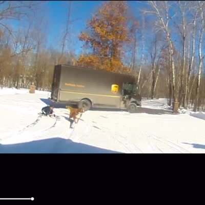 A large mixed-breed dog pulls a woman across the driveway with his leash when he runs to bark at the UPS delivery driver.