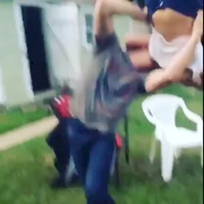 A man lifts a woman in the air and drops her on a lawn chair that breaks.