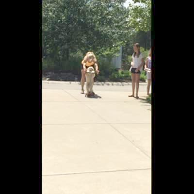 A dog rides a scooter down a driveway hill on his hind legs as a family cheers him on.