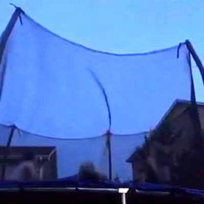 A young boy bounces on an exercise ball on a trampoline. The boy flies over the safety net and gets stuck on top of it.