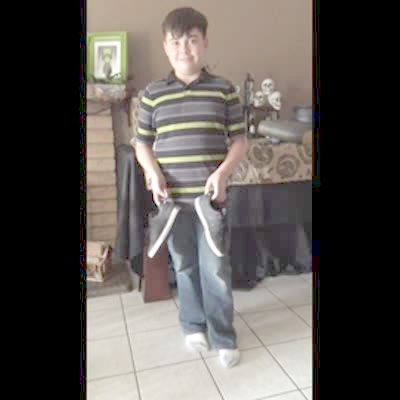 A young boy throws his shoes to prove that they land right side up each time. When he throws the second shoe it lands upside down but then slowly rolls right side up.
