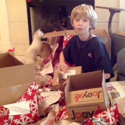 Two cats play in wrapping paper while a boy opens gifts at home. One cat jumps up to grab a box and the box tilts over onto the cat, trapping it.