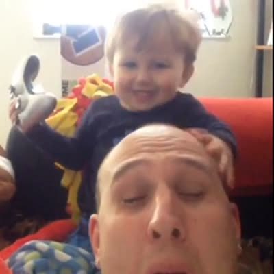 "GROIN BITTER" A tot baby boy waves his hands around while trying to play with an Xbox kinect game with a man indoors. A Boston Terrier dog jumps up and bites the man in the groin.