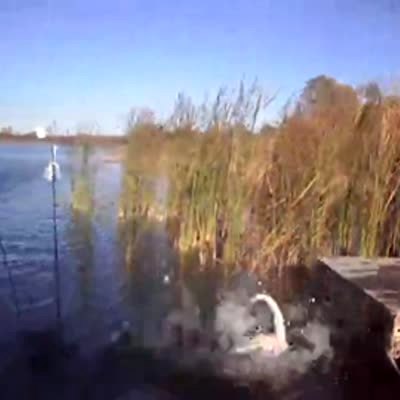 A man and a woman as well as a Yellow Lab dog ride in a canoe. From the shore, a man calls for the dog, and then tosses something into the air. The dog leaps out of the canoe and it then pitches sideways, and capsizes.
